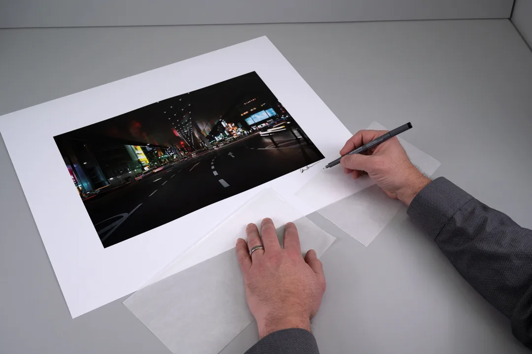 - If signing on the back, be mindful of the location as signing too close to the edge of the paper may get cut off during the framing process, and don’t press too hard! An indentation in the surface from the pressure would be a serious bummer.